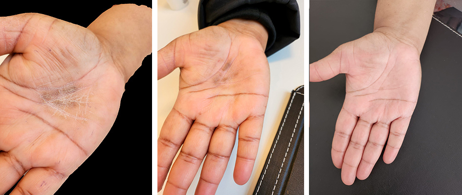 Op de eerste foto is te zien dat de kleur van de handen van deze klant niet normaal is, vooral de vingers zijn pijnlijk en rood. Na de behandeling zijn de vingers niet meer ontstoken en pijnlijk en hebben de handen weer de normale kleur gekregen.