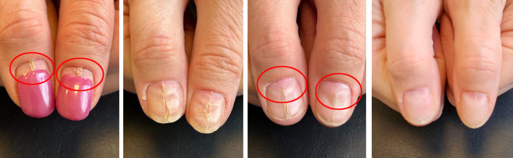 Veertig jaar geleden vertelden artsen aan deze klant dat schade aan de voorkant van de nagel tot nagelscheuren kan leiden en dat er geen manier is om dit te elimineren. Symptomen verschijnen niet alleen op de nagels. Verder had zij fysieke symptomen: het lichaam verkeert al tientallen jaren in een zeer, zeer vermoeide toestand. Nu is door de behandeling de toestand van het hele lichaam verbeterd en zijn allerlei lichamelijke ongemakken en vermoeidheid verdwenen. Na 40 jaar zijn de nagels normaal gaan groeien en zijn er geen scheuren meer in de nagels. Zij heeft geen manicure meer nodig.