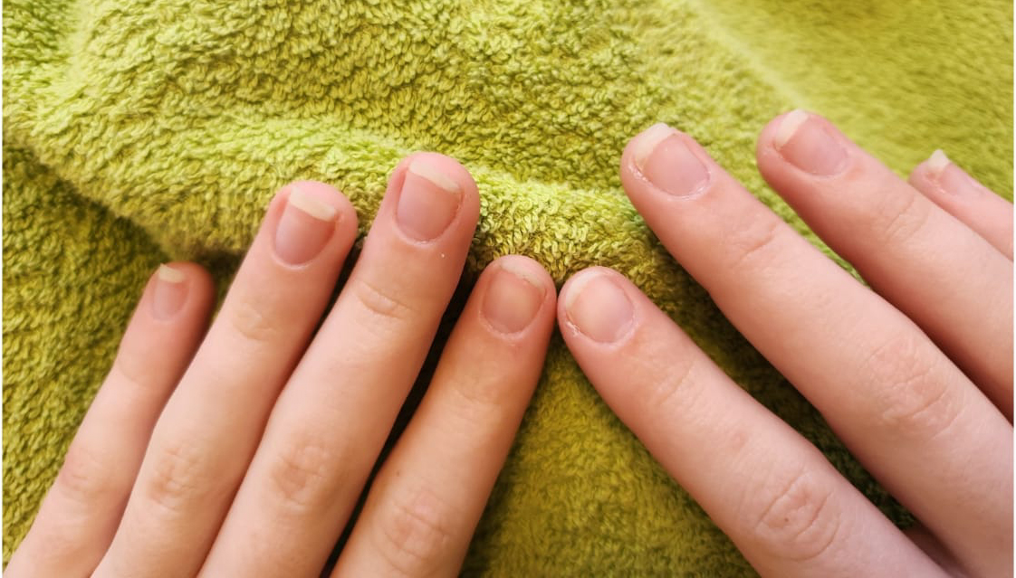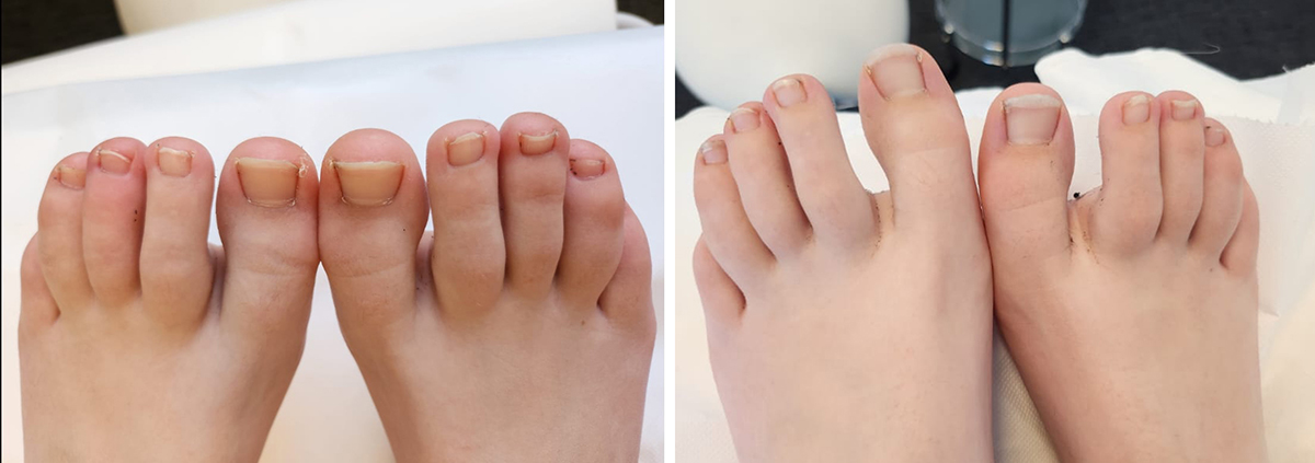 De nagels van dit 14-jarige meisje zijn weer gezond van kleur. In het begin waren ze geel. Na een aantal behandelingen zijn zowel de vinger- als de teennagels weer roze.