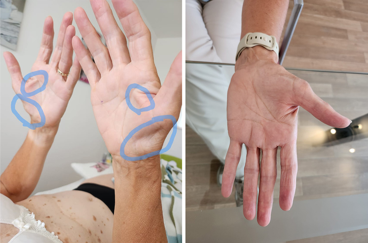 Deze foto is van een client die al heel lang aan verschillende chronische ziekten lijdt. Je kunt de veranderingen in het lichaam door kortdurende therapie zien door de foto’s van haar hand te vergelijken.