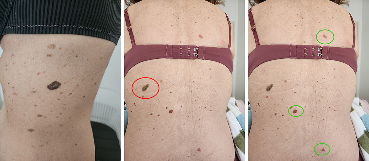 2. Kijk eens naar de vergelijking op deze foto. Het melanoom linksonder op de rug is van zwart naar grijs verkleurd. Het is ook verschrompeld en langzaam weggevallen, bijna volledig verdwenen.