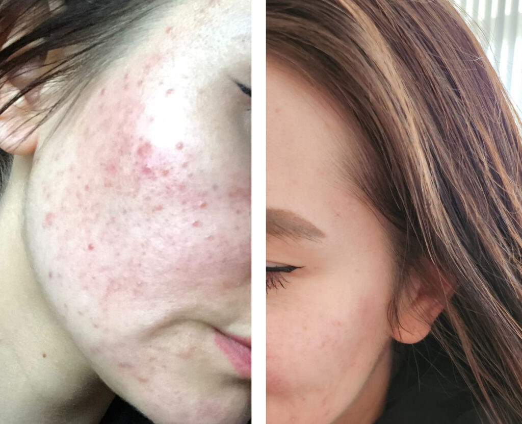 Nu ze gezond is na de behandeling, heeft haar gezicht weer een gezonde en normale huidskleur.