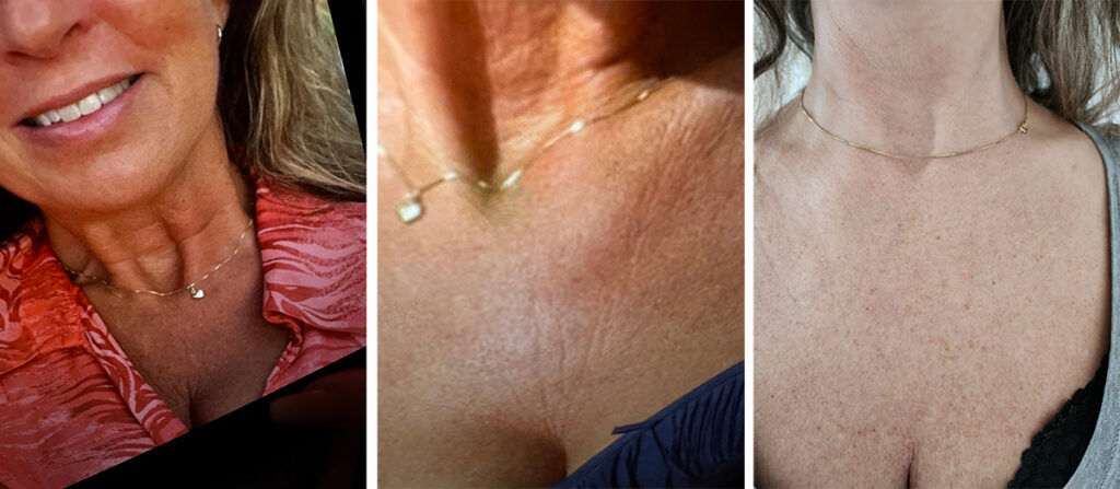 Als je naar de eerste twee foto’s kijkt, zie je veel rimpels op haar borst. De derde foto laat het resultaat na de behandeling zien; je kunt duidelijk zien dat de rimpels op haar borst verdwenen zijn. Niet alleen zijn de rimpels op haar gezicht en borst verdwenen, maar haar teint is ook roziger geworden en haar huid is stevig en glad. Haar vrienden waren verbaasd toen ze haar zagen en prezen haar dramatische transformatie en stralende uiterlijk. Ze vroegen haar welk cosmeticamerk ze gebruikte. Tijdens het boodschappen doen in de supermarkt complimenteerde de caissière haar teint en huid, vroeg naar haar leeftijd en leek te twijfelen aan haar werkelijke leeftijd. Haar nagels groeien erg snel; voorheen groeiden ze nauwelijks en vertoonden ze geen tekenen van groei. Nu is haar haar glad en glanzend en straalt ze vitaliteit uit. Een gezond lichaam kan iemands leeftijd en huidstructuur veranderen. Sterker nog, voordat ze bij mij kwam, was haar gezondheid niet goed; al meer dan twintig jaar was haar gezondheid slecht. Haar teint was dof, haar gezicht zat vol oneffenheden en ze leed aan meerdere chronische ziekten. Ze voelde zich altijd zwak en niet in staat om normaal te leven en te werken en had het hele jaar door last van diverse lichamelijke klachten, vooral vanaf september. Maar nu is ze anders. Voor het eerst in twintig jaar is ze het hele jaar 2025 gezond gebleven. Haar familie was dolblij en ze kon het zelf nauwelijks geloven. “Ik voel me zo gelukkig! Het is geweldig, alsof er een nieuw leven is begonnen. Ik heb elke dag zoveel energie en ik heb nergens meer last van, geen pijn of ongemak in mijn lichaam.”